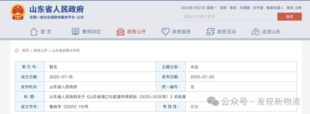 關于《山東省港口與航道布局規(guī)劃(2025-2035年)》的批復